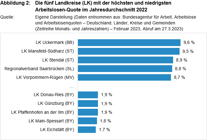 Die höchsten Arbeitslosen-Quoten haben v.a. Landkreise in den neuen Flächenländern. Einzig der Regionalverband Saarbrücken fällt hier aus der Reihe. Am höchsten ist die Arbeitslosen-Quote im Landkreis Uckermark (9,6 %) und im Landkreis Mansfeld-Südharz (9,5 %). Beide Landkreise gelten wirtschaftlich als strukturschwach.